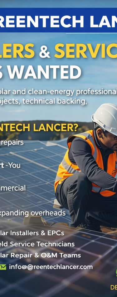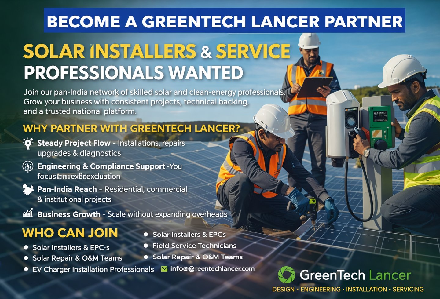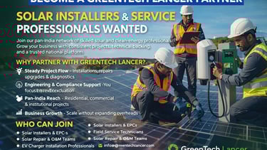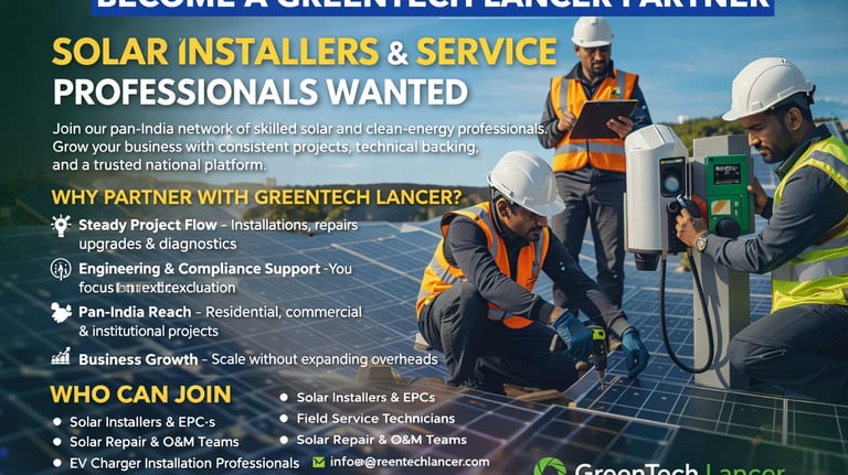 GreenTech Lancer is a unified clean-energy engineering platform enabling the successful execution of solar and EV charging projects across India. From approval-ready design documentation and technical engineering validation to on-site solar repairs, upgrades, and system expansion, we support the complete project lifecycle.